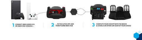 With the Alpha Flight Controls XPC and Honeycomb Xbox Hub you can connect the Bravo Throttle Quadrant and Charlie Rudder Pedals as one system to your Xbox Series X|S or Xbox One.